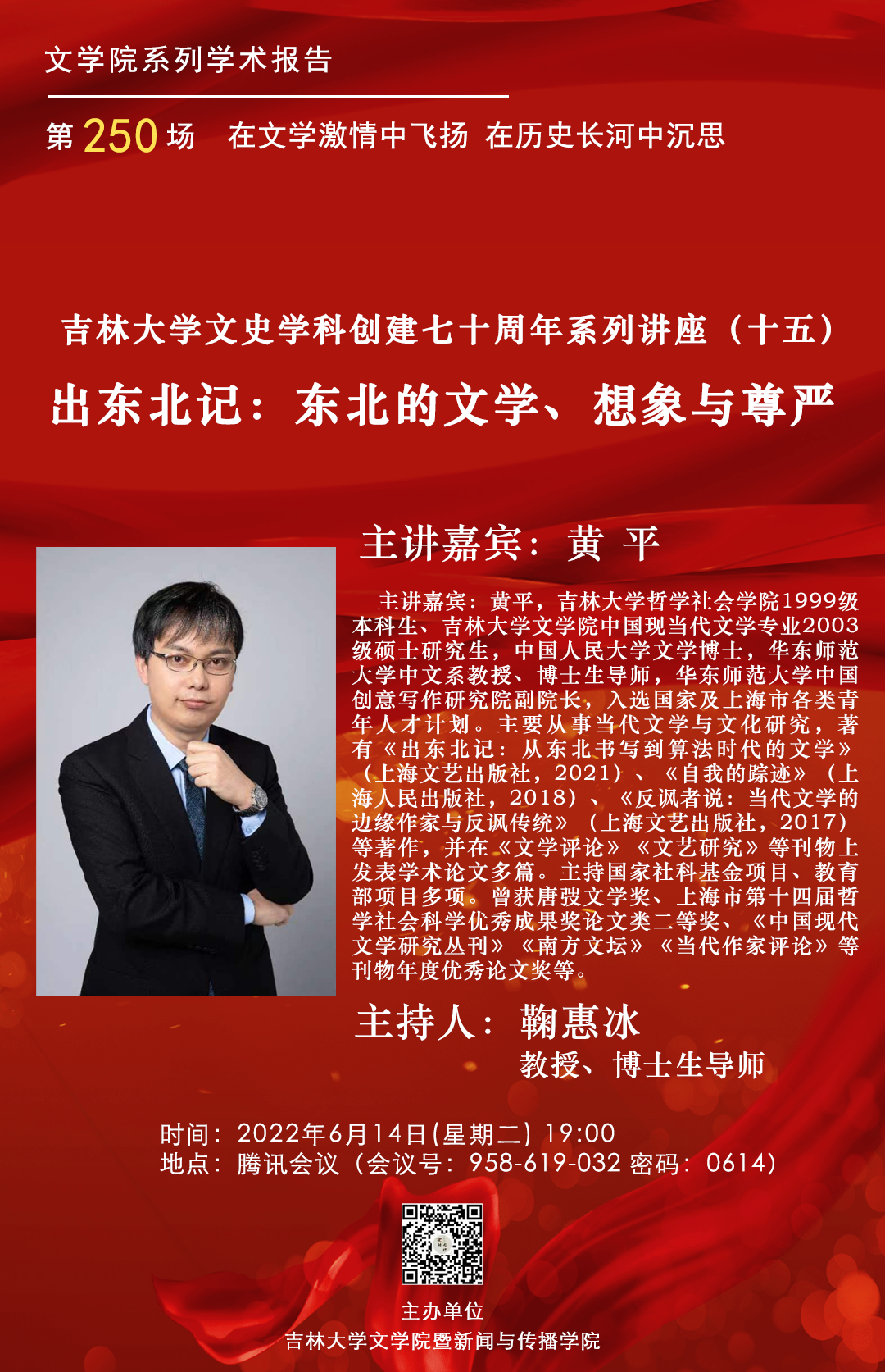 主讲人信息:黄平,吉林大学哲学社会学院1999级本科生、星空注册中国现当代文学专业2003年硕士研究生,中国人民大学文学博士,华东师范大学中文系教授、博士生导师,华东师范大学中国创意写作研究院副院长,入选国家及上海市各类青年人才计划。主要从事当代文学与文化研究,著有《出东北记:从东北书写到算法时代的文学》(上海文艺出版社,2021)、《自我的踪迹》(上海人民出版社,2018)、《反讽者说:当代文学的边缘作家与反讽传统》(上海文艺出版社,2017)等著作,并在《文学评论》《文艺研究》等刊物上发表学术论文多篇。主持国家社科基金项目、教育部项目多项。曾获唐弢文学奖、上海市第十四届哲学社会科学优秀成果奖论文类二等奖、《中国现代文学研究丛刊》《南方文坛》《当代作家评论》等刊物年度优秀论文奖等。