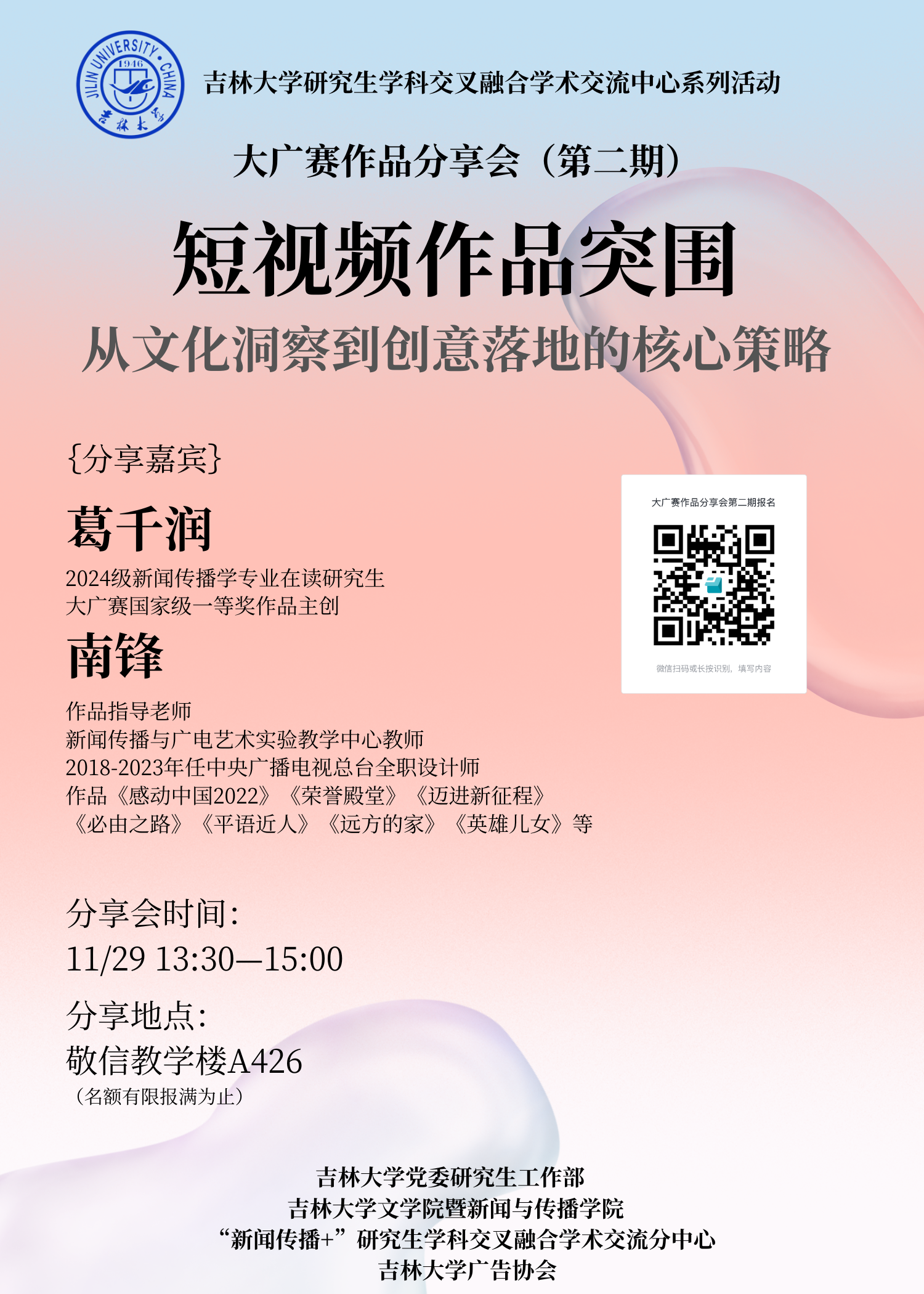主讲嘉宾简介: 葛千润,星空注册暨新闻与传播学院2024级新闻传播专业在读研究生,大广赛国家级一等奖作品主创。