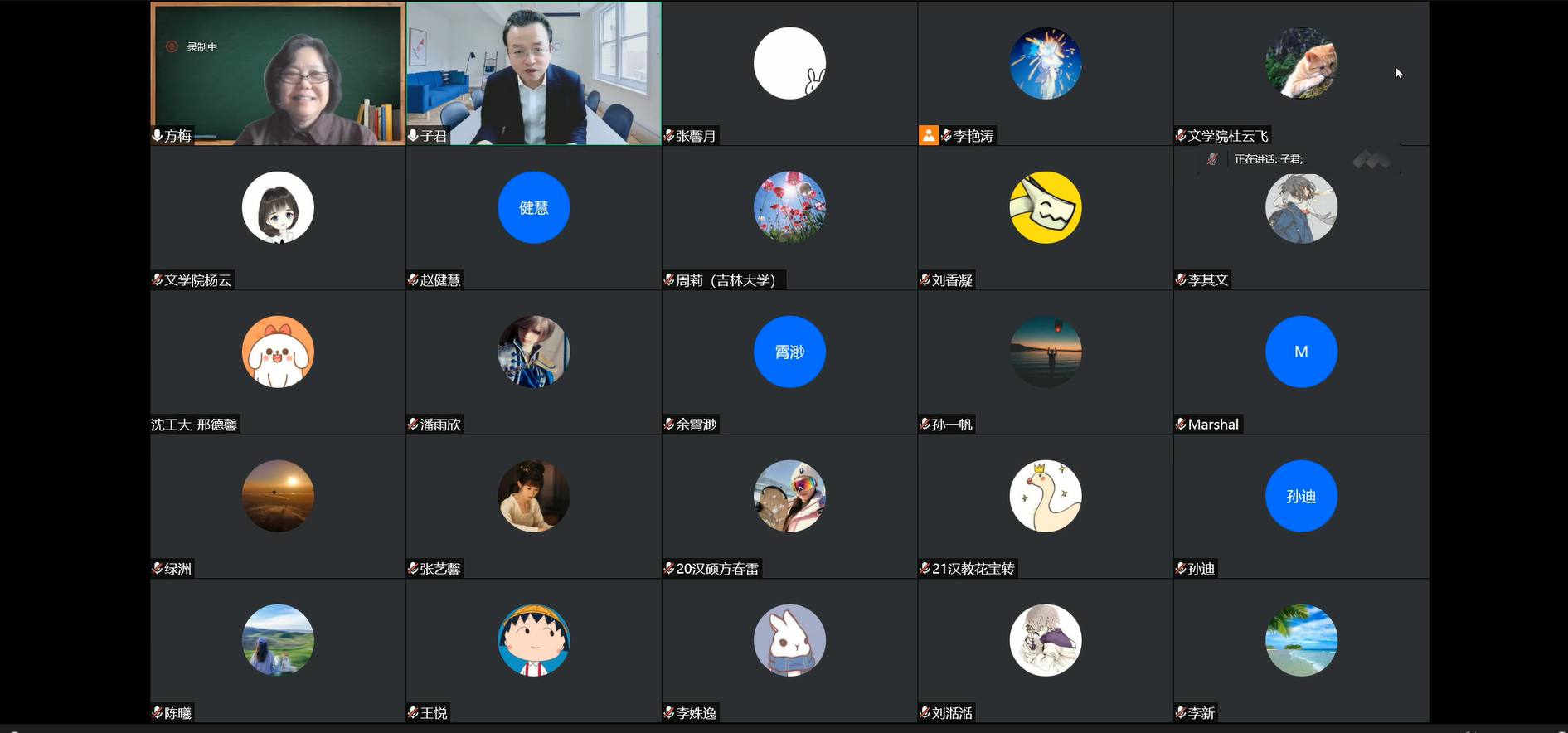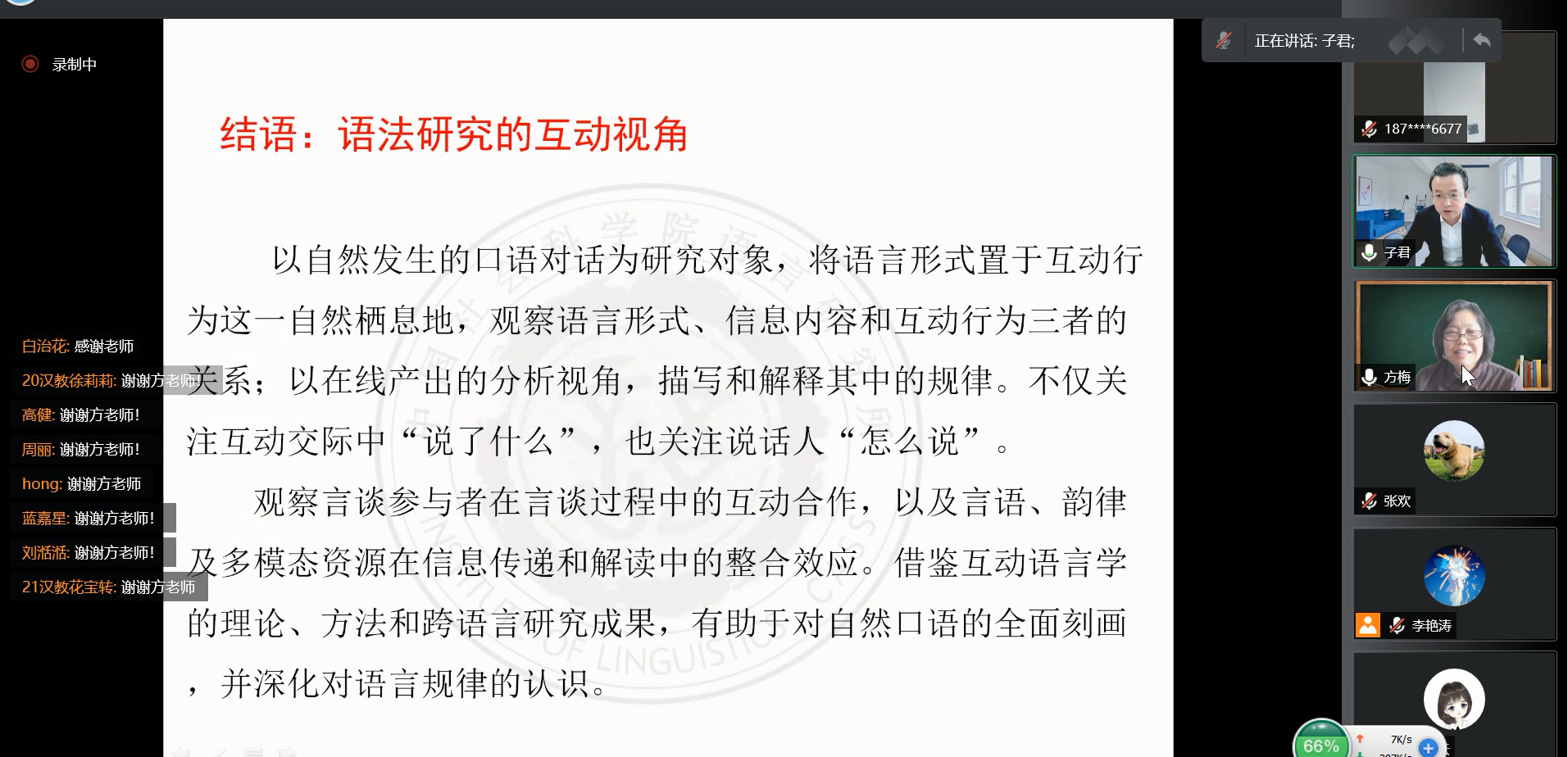 2022年5月11日上午九点,中国社会科学院语言研究所研究员、教授、博士生导师,《中国语文》副主编、中国语言学会副会长方梅教授于腾讯会议线上为我校师生带来名为“语法研究的互动视角”的专题学术讲座。讲座由星空注册语言学教研室李子君教授主持,徐正考教授、柳英绿教授、吕明臣教授、岳辉教授、刘艳茹教授等教师以及诸多学子都参加了此次线上讲座。此次讲座是吉林大学哲学社会科学名家讲座第1117场。