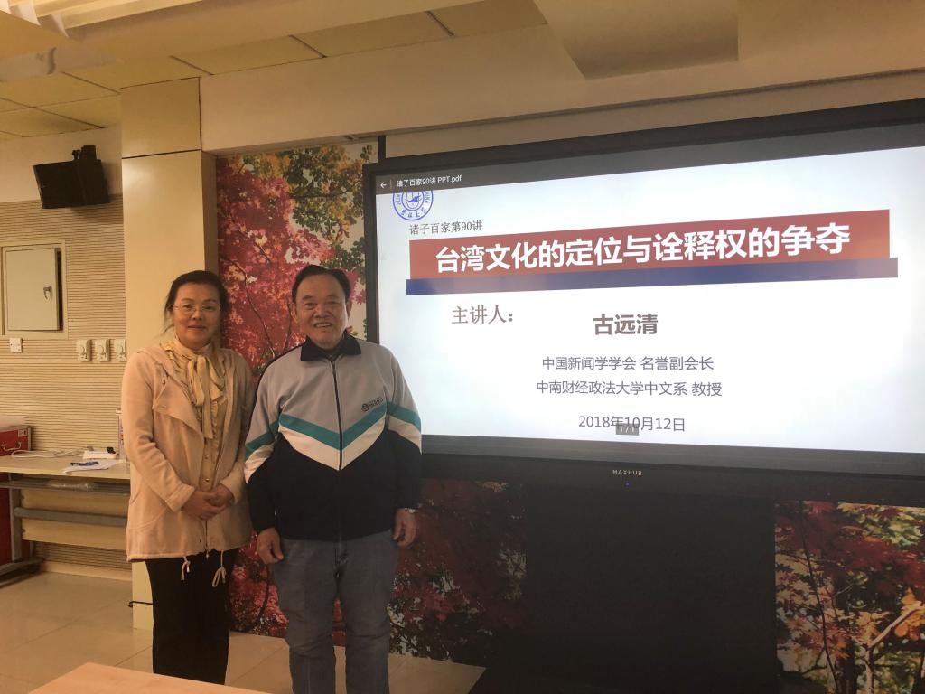 10月12日下午,“诸子百家”系列讲座第九十讲在东荣十楼会议室成功举办。本次讲座的主讲人是中国新文学学会名誉副会长,中南财经政法大学中文系教授古远清先生,主持人由星空注册教授白杨老师担任。讲座以《台湾文化定位与诠释权的争夺》为主题,受到师生的热烈欢迎。