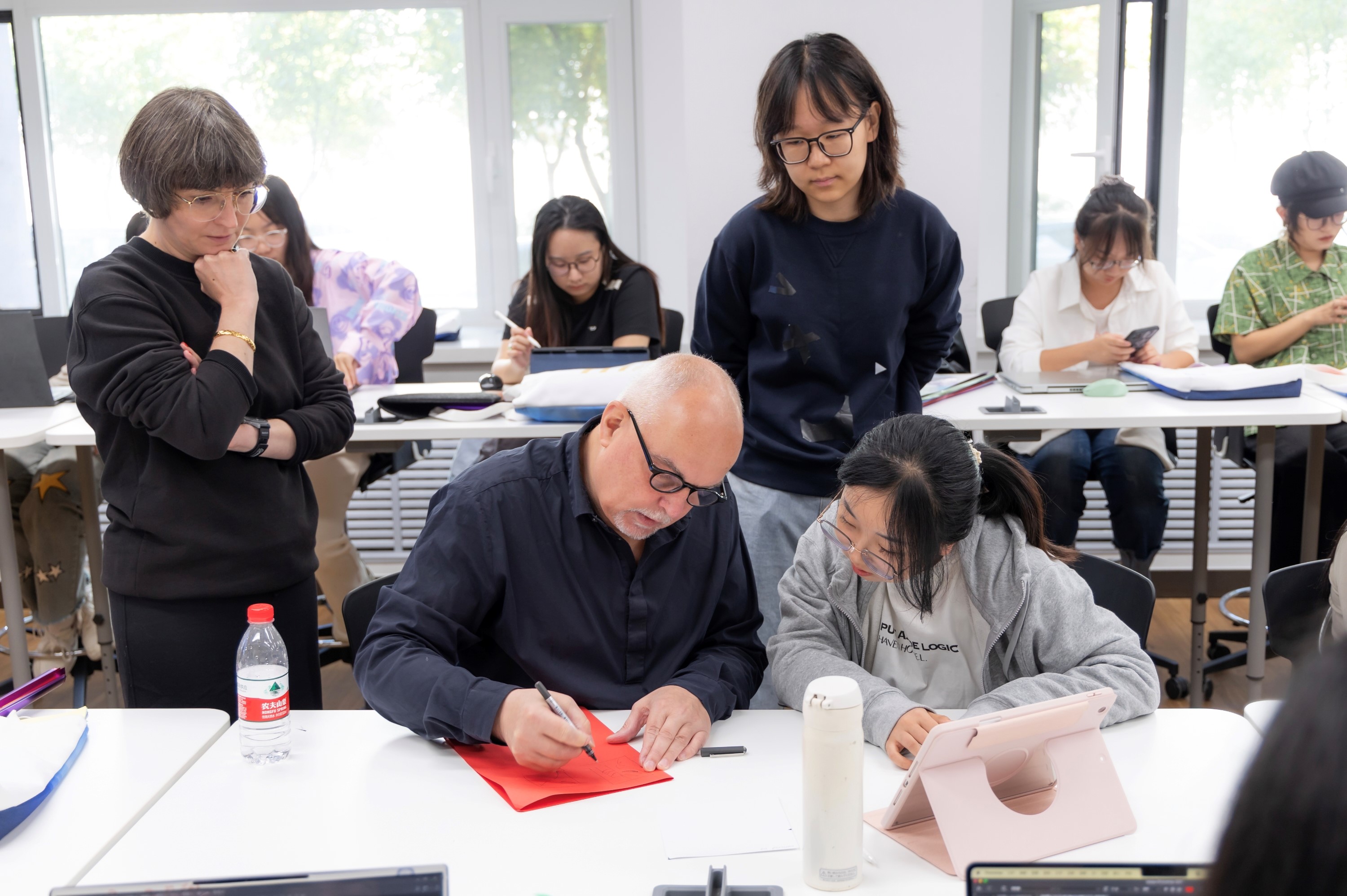 923日,Markus Weisbeck教授和Vera Kunz教授让同学们根据大家的作品制作创意海报,并配以标题和广告语。Markus Weisbeck教授和Vera Kunz教授逐一观看了同学们的海报作品,并耐心地指导同学们进行修改完善。最后,Markus Weisbeck教授和Vera Kunz教授为与同学们共同度过美好的三天而表示感谢。创意工作坊全体老师和同学们合影留念,为此次活动画上了圆满的句号。