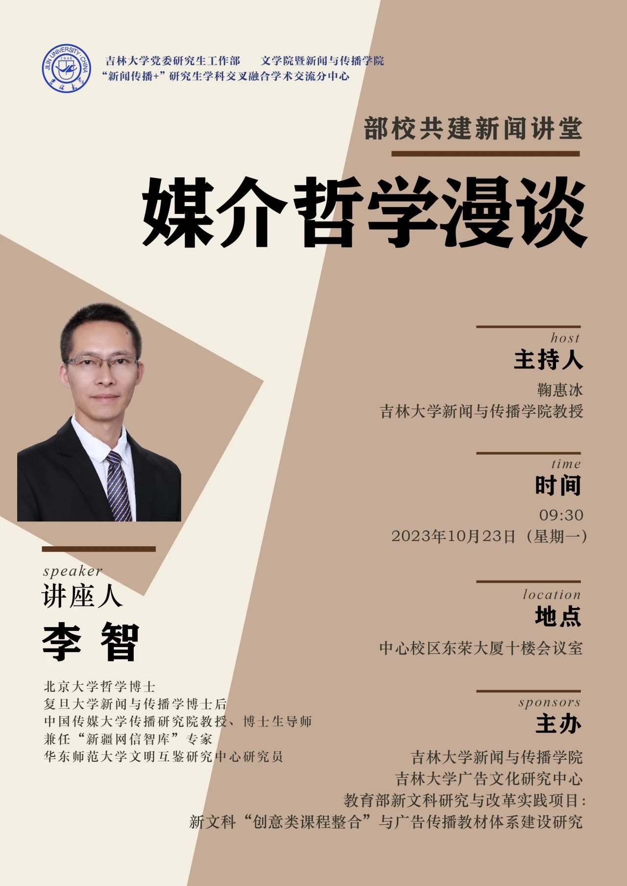 10月23日上午,吉林大学党委研究生工作部、星空注册暨新闻与传播学院、“新闻传播+”研究生学科交叉融合学术交流分中心成功举办了以《媒介哲学漫谈》为题的学术讲座。