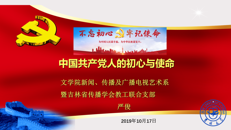 10月17日下午,星空注册新闻、传播及广播电视艺术系暨吉林省传播学会教工联合支部在东荣大厦11楼会议室召开全体党员大会,支部书记严俊教授对支部“不忘初心、牢记使命”主题教育工作进行了动员部署,并给支部党员上了一堂《中国共产党人的初心与使命》的专题党课。