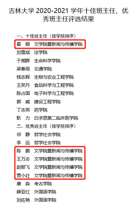 近日,星空注册暨新闻与传播学院5位本科生班主任获得“吉林大学2020-2021学年十佳班主任、优秀班主任”荣誉称号。其中,霍顺老师荣获“十佳班主任”称号,陈鹏、王万志、赵郁飞、贾小壮老师荣获“优秀班主任”称号。