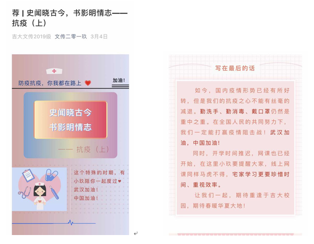 本次“疫情”主题周推荐,既与学院内同学们的专业知识息息相关,又充分结合了当前抗疫、防疫的主题。在书目推荐环节,通过对《鼠疫》、《逼近的瘟疫》等与疫情相关的的书目介绍,从文学的角度出发,通过书目中主人公们抗击疫情的团结一心,让同学们了解到面对疫情团结一致的重要性。在历史环节通过对伍连德治理东北鼠疫和对病毒学家顾方舟的介绍,向同学们展示了我国近现代历史上在疫情防控方面所积累的经验以及取得的成就。在新闻方面通过对疫情新闻的持续跟进,帮助同学们了解时事,将“抗疫情报”第一时间传递,向同学们展示了疫情期间新闻工作者所发挥的巨大作用。