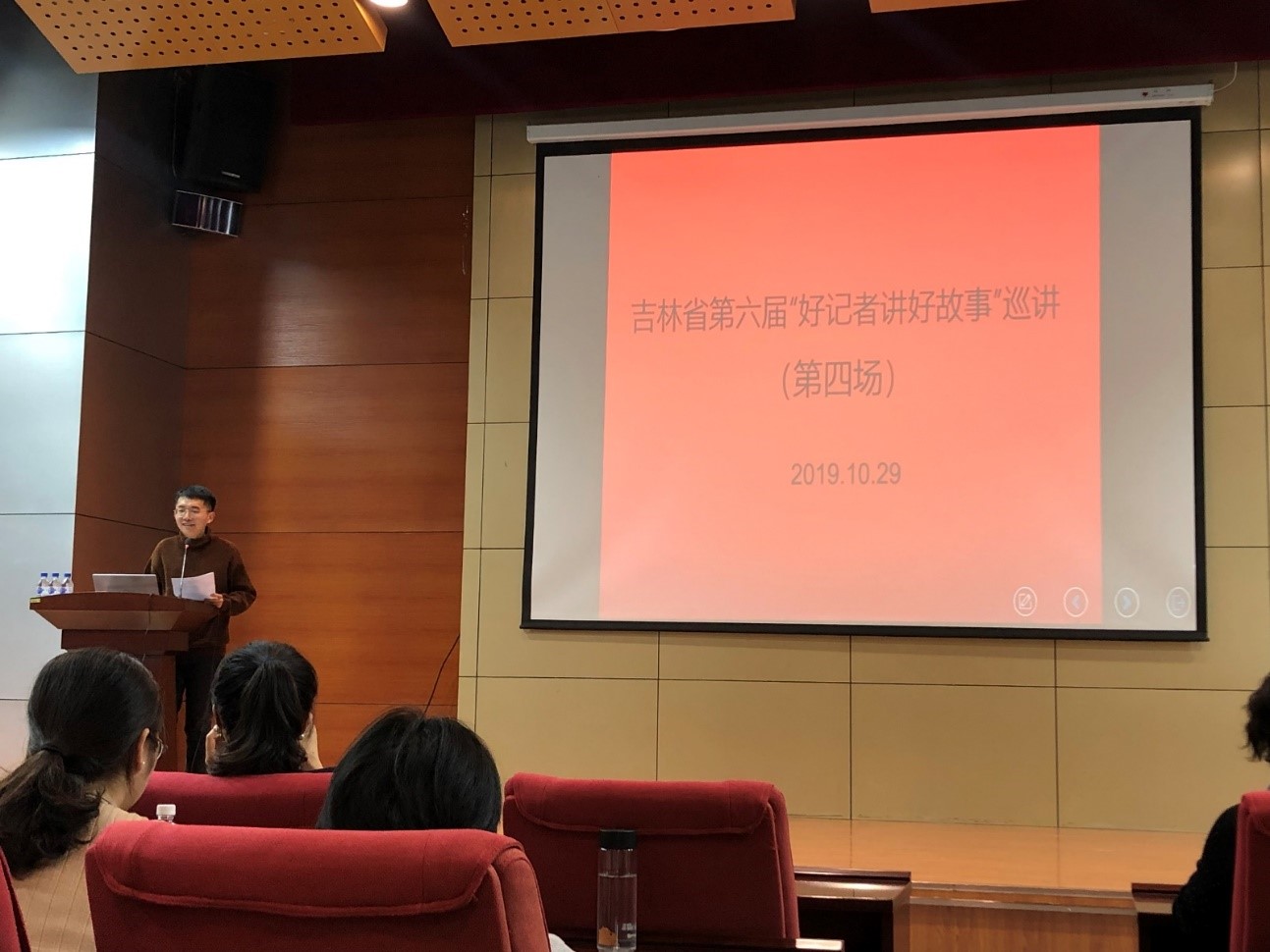 【吉林大学新闻与传播学院 宋雨潼/文摄】为贯彻落实习近平总书记关于宣传思想战线不断增强“脚力、脑力、眼力、笔力”的重要指示精神,在第20个中国记者节来临之际,吉林省第六届“好记者讲好故事”巡讲正式启动。10月29日,第四场巡讲在吉林大学中心校区国际学术大讲堂召开,由吉林大学新闻与传播学院承办。来自吉林大学、东北师范大学、吉林师范大学的师生参加了此次活动,在聆听动情时眼含泪光,掌声如潮。本场巡讲由吉林大学新闻与传播学院新闻系学生代表曲昭琦同学主持。